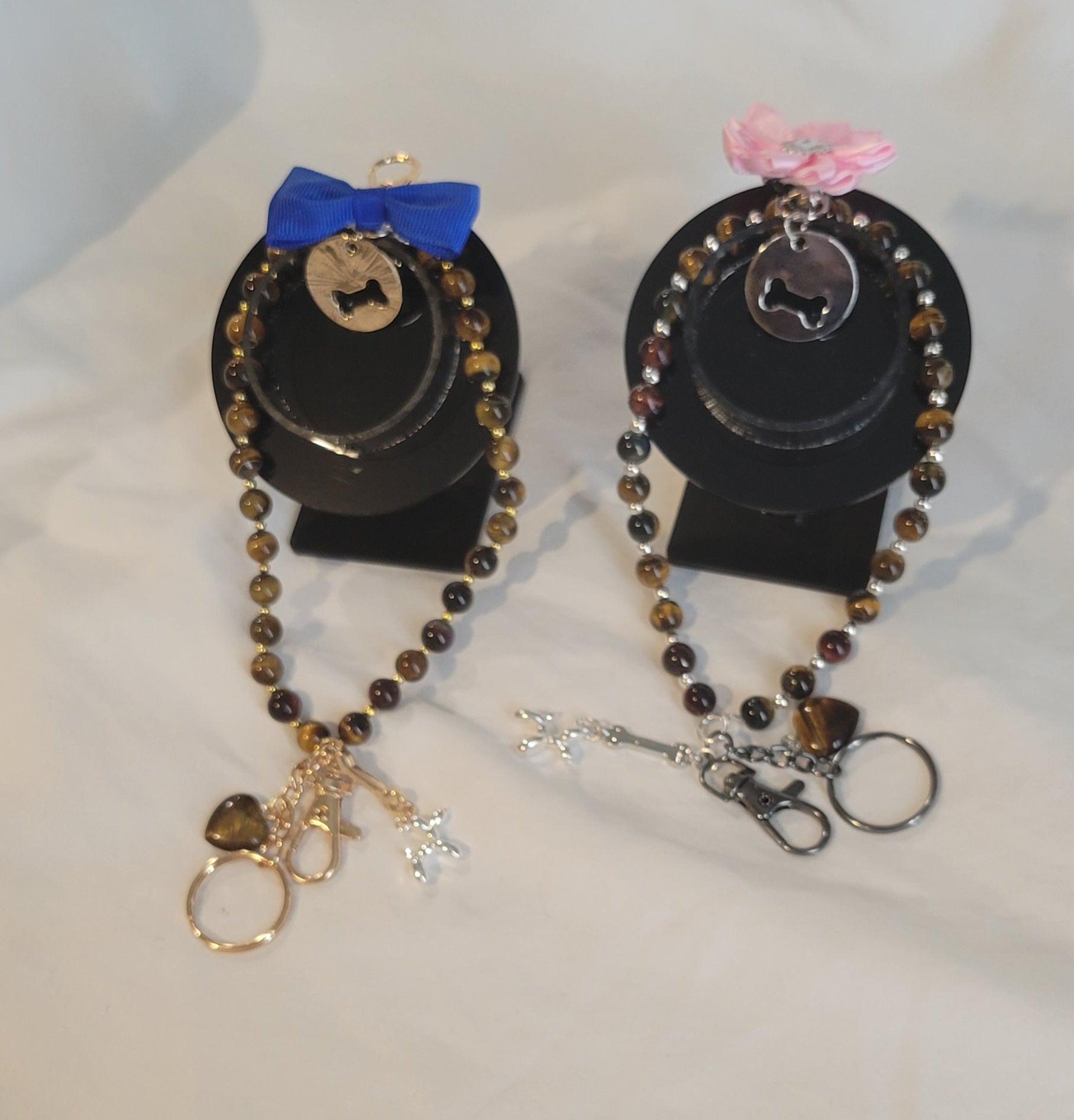 Show your love for your pup with matching bag charm and collar charm. The bag charm is made from natural tiger eye with a tiger eye charm, balloon dog, and bone. The pup collar tag has either a blue bow or a pink flower and has the charm with a cutout of the bone that is on your bag charm.