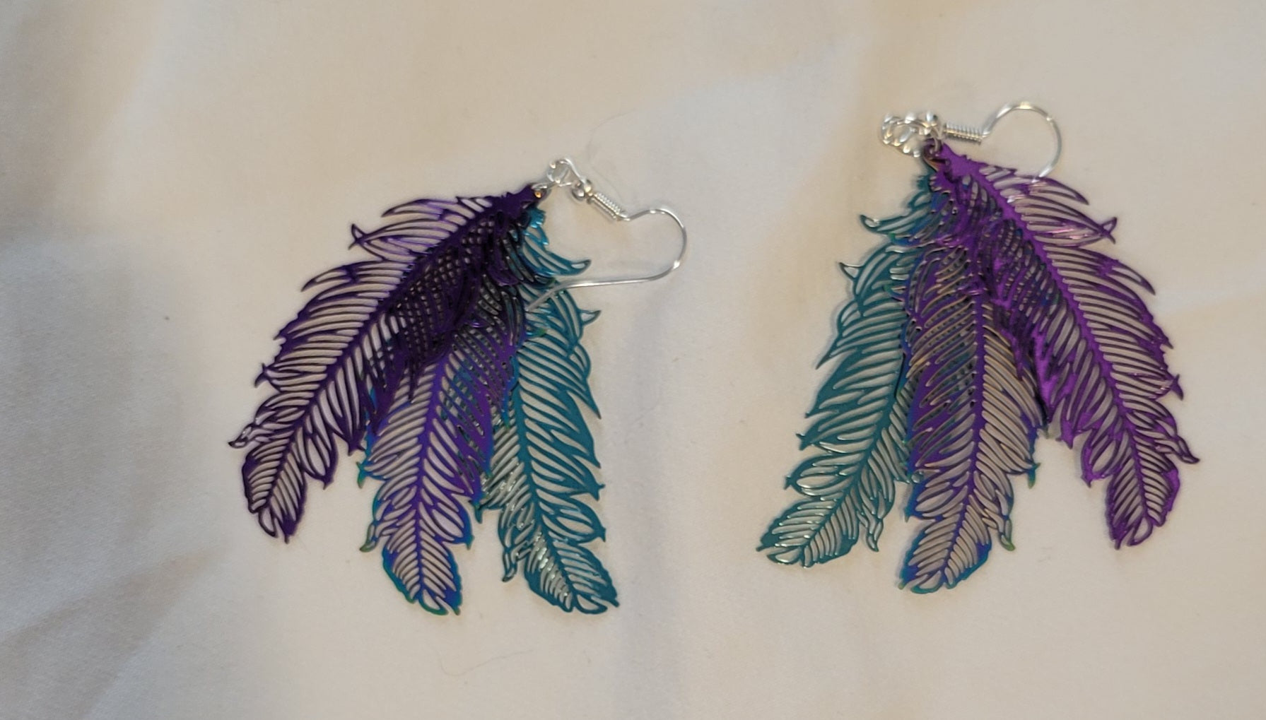 Enhance your style with these stunning Feather Earrings. Featuring detailed metal feathers in hues of blue and purple, these 2" earrings will add a touch of elegance and sophistication to any outfit. Elevate your look with these unique and eye-catching accessories.