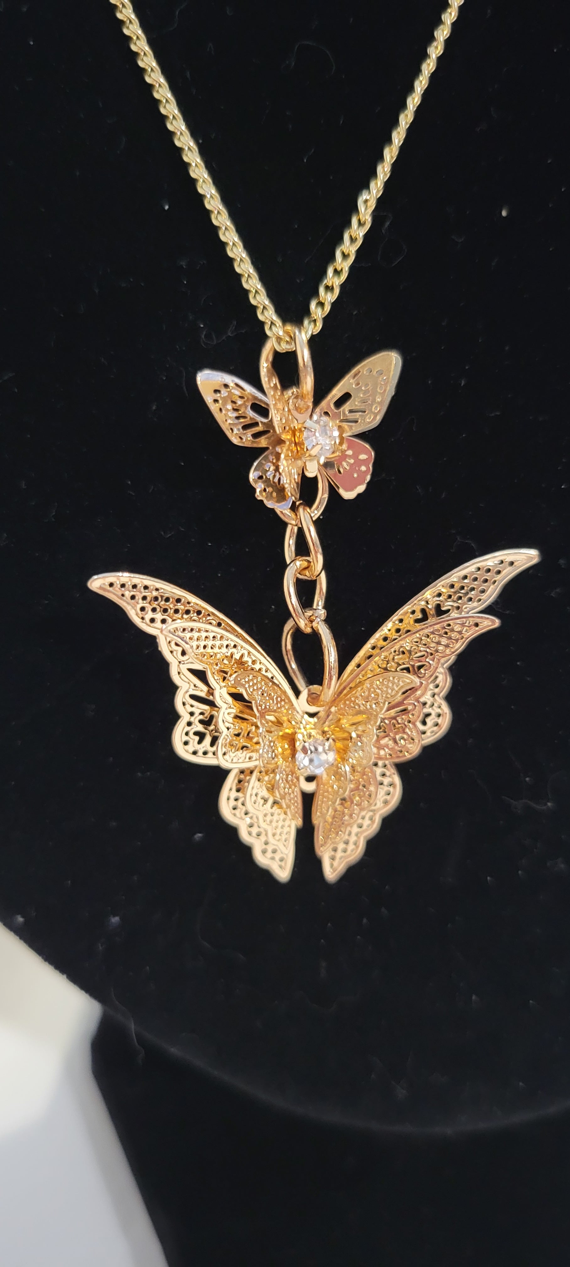This Gold Butterfly Necklace and Earring Set is a stunning addition to any jewelry collection. Made of gold filled material, it features delicate cubic zirconia accents in the center of the butterfly charms. The matching earrings complete the look, making this set a must-have for any fashion-forward individual.