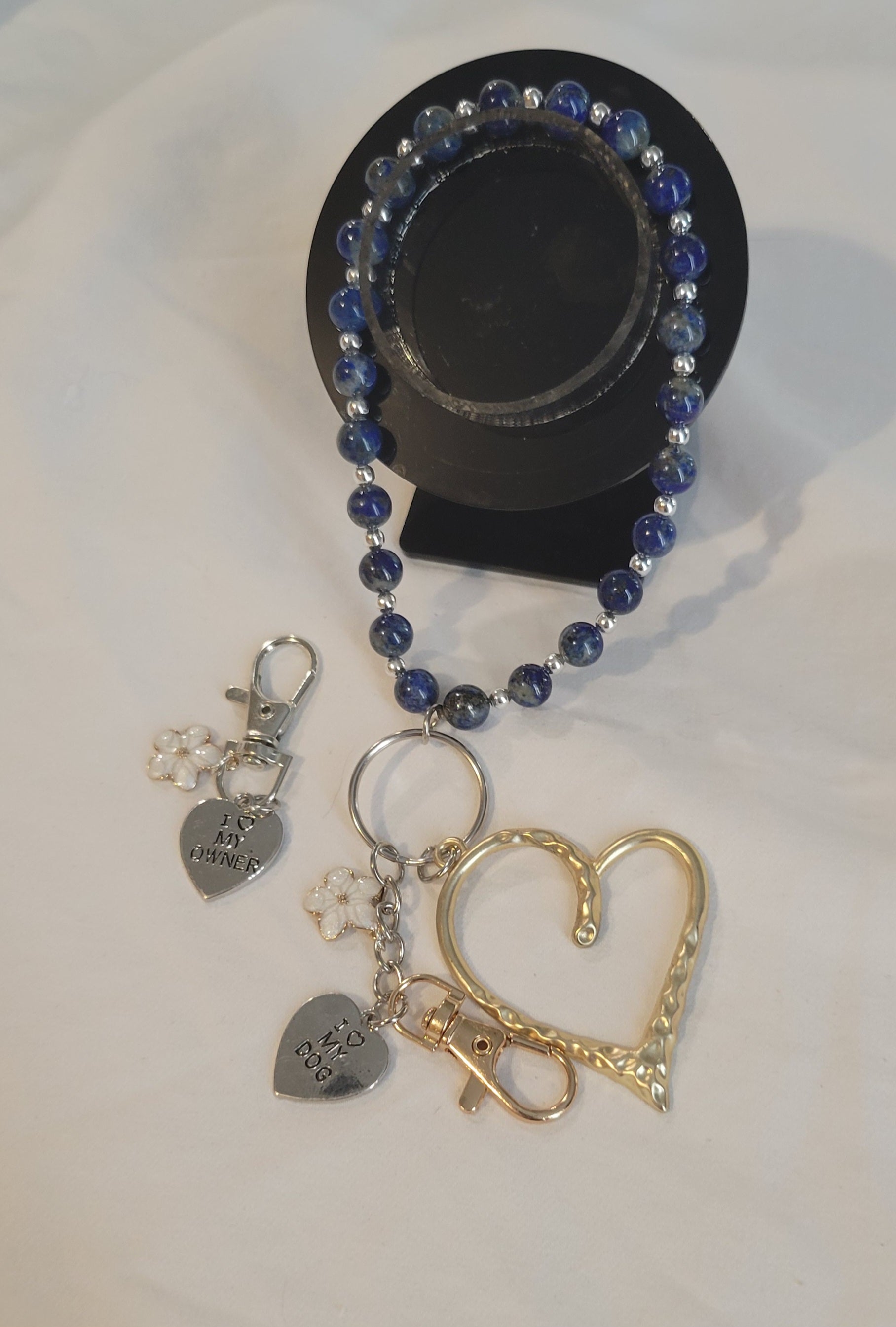 The bag chain has a large heart charm, flower enamel charm, and a charm that reads "I heart my dog". The chain is natural lapis. The pups collar charm has the matching enamel flower and a charm that reads, "I heart my owner".