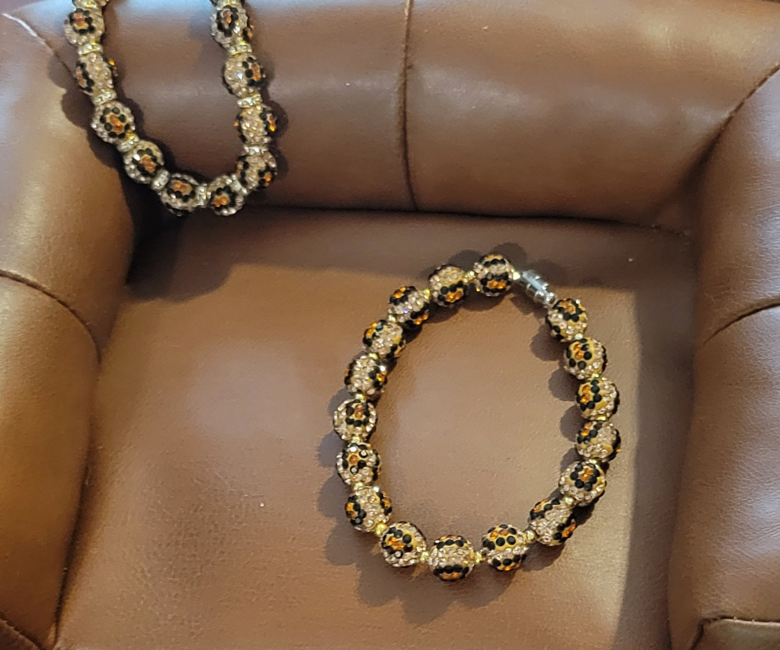 This is ore design with the most sparkle and glam around. Leopard print crystals cover clay beads with a magnetic close which makes it so easy to put your bracelet on. 7.5"